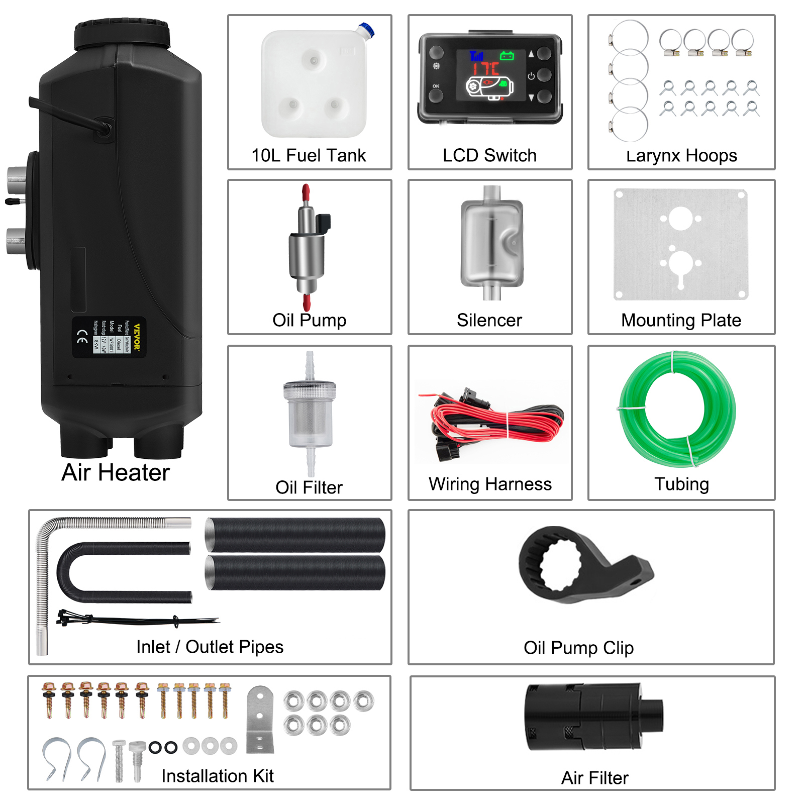 When cold weather hits, this 8KW 12V Diesel Air Heater is your perfect companion for staying warm on the road or at home. Built for fast, efficient heating, this diesel heater brings powerful warmth even in extreme cold down to -40°F. Whether you’re clearing frost from your vehicle’s windows or heating up your RV, trailer, boat, or cabin, this heater gets the job done quickly and quietly. With low fuel consumption and smart digital controls, you can enjoy continuous warmth without worrying about running costs. The included LCD panel lets you adjust temperatures with ease — whether manually or with the automatic mode. Thanks to its flexible installation options, this heater can fit in cabins, trunks, under seats, or in storage areas, giving you the freedom to place it wherever you need it most. This heater isn’t just for vehicles. It’s also perfect for use in garages, workshops, warehouses, and tiny homes. Anywhere you need dependable, efficient heating, this compact yet powerful unit delivers.