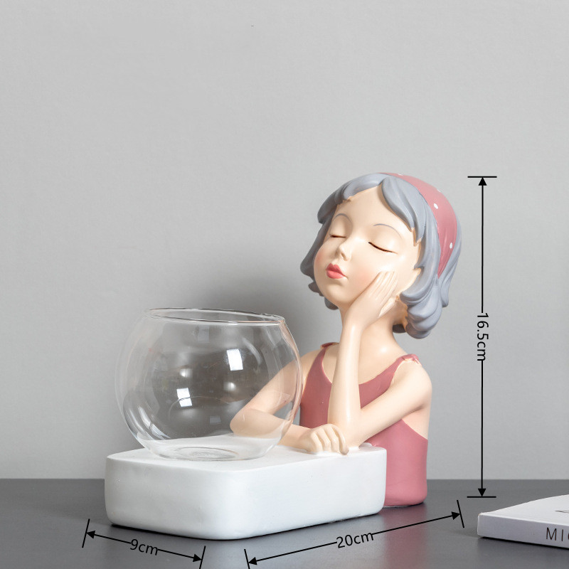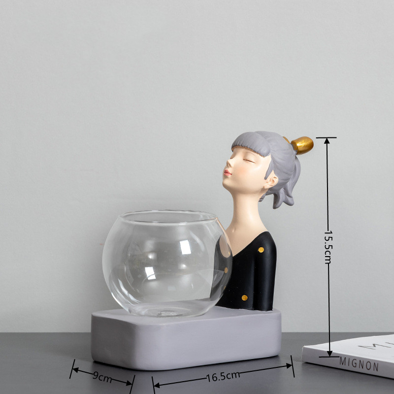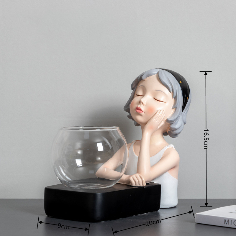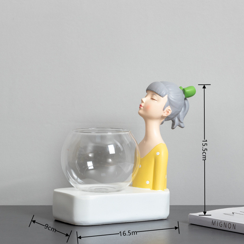 Unlike ordinary vases, this piece combines artistry with utility. The elegant resin girl sculpture captures emotion and charm, while the glass vase allows you to nurture a living plant in style. The subtle lighting feature transforms it into an enchanting night lamp—making it a true fusion of nature, art, and innovation.