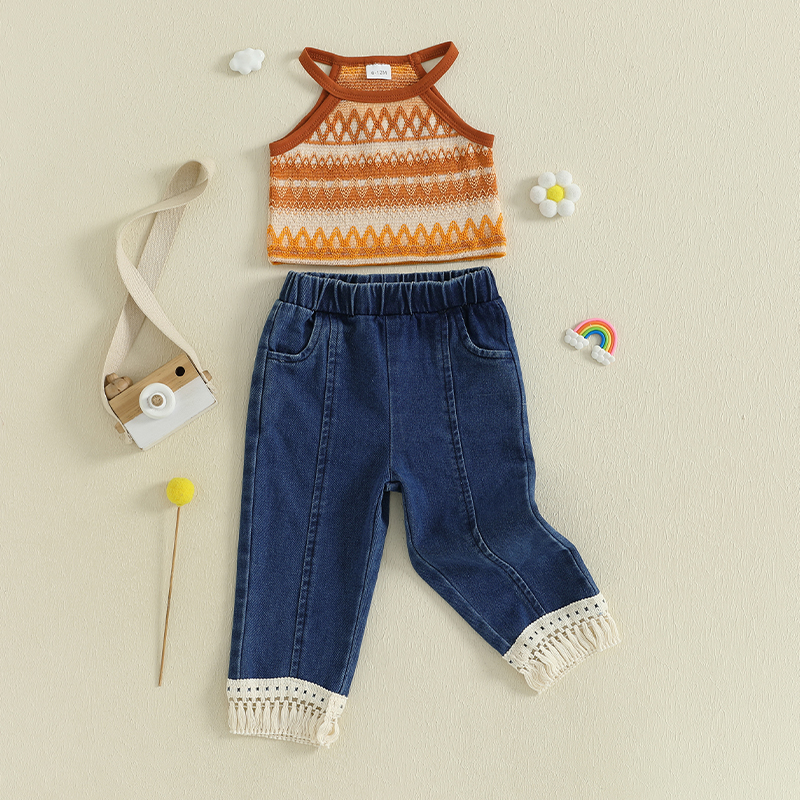 Let your little one shine this summer with our adorable Girls Pants Set — a perfect blend of comfort and style. This two-piece outfit features a sleeveless knit camisole top paired with trendy elastic waist tasseled jeans. Designed with playful summer days in mind, this set is the ideal choice whether your child is playing in the park, attending a birthday party, or simply enjoying family outings.
