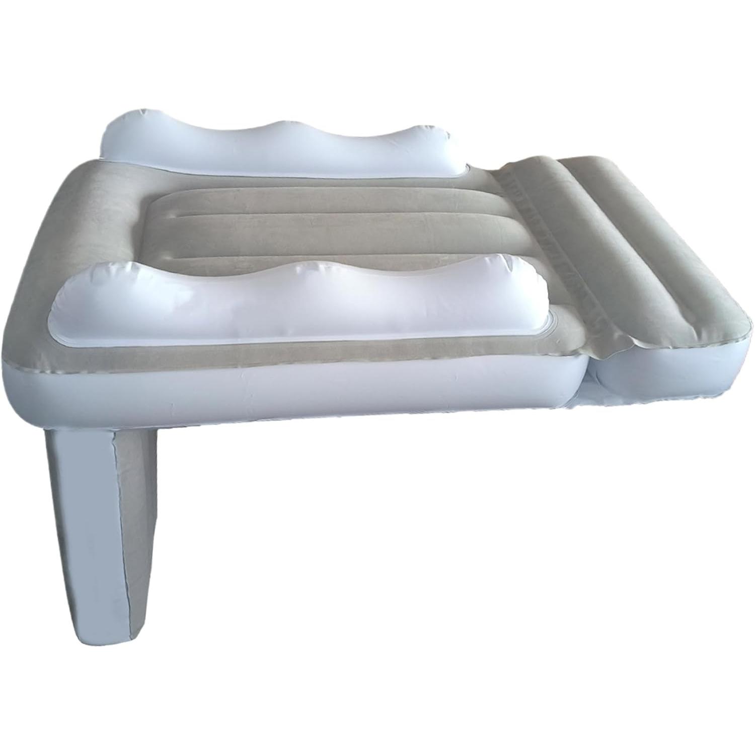 This inflatable travel bed is crafted with soft flocking fabric and durable PVC, offering a plush yet supportive resting surface. The raised side bumpers provide extra security, while the included three-point safety belt keeps your child safely in place throughout the ride. Measuring approximately 31.5 x 23.6 x 19.7 inches, it fits most economy car and airplane seats, turning travel time into rest time in just a few minutes.