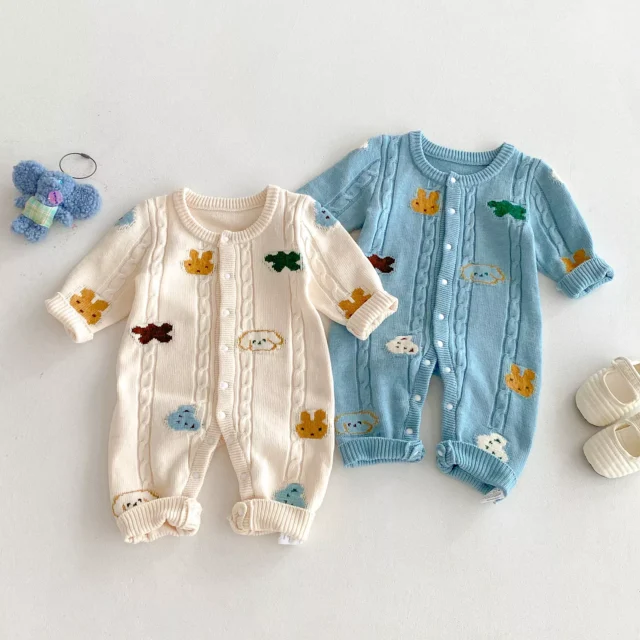 Made from a premium blend of viscose, polyester, and nylon, this romper feels luxuriously soft against delicate skin while allowing gentle stretch for movement. The knitted texture provides natural warmth. A simple pullover closure ensures easy dressing, while the O-neck collar and long sleeves offer full coverage and comfort for cooler days.
