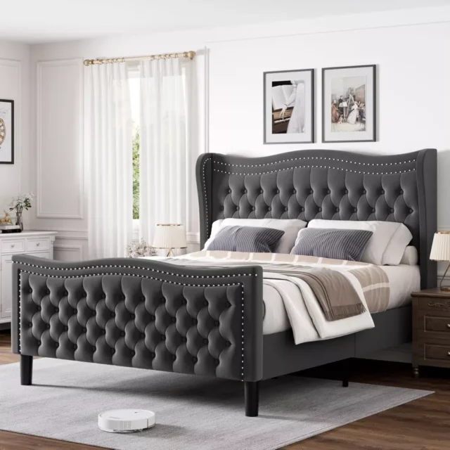 Transform your bedroom into a sanctuary of style and comfort with our Luxurious King Size Platform Bed Frame. This stunning bed features a 52-inch tall wingback headboard, beautifully upholstered in soft chenille fabric, making it a striking centerpiece for any modern bedroom. The elegant scroll design adds a touch of sophistication, while deep button tufting ensures supreme comfort for relaxing against the headboard.