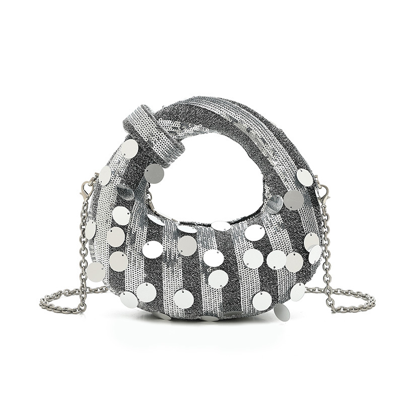 • Design: Pleated half-moon shape with tassel, diamond, chain, and sequin accents