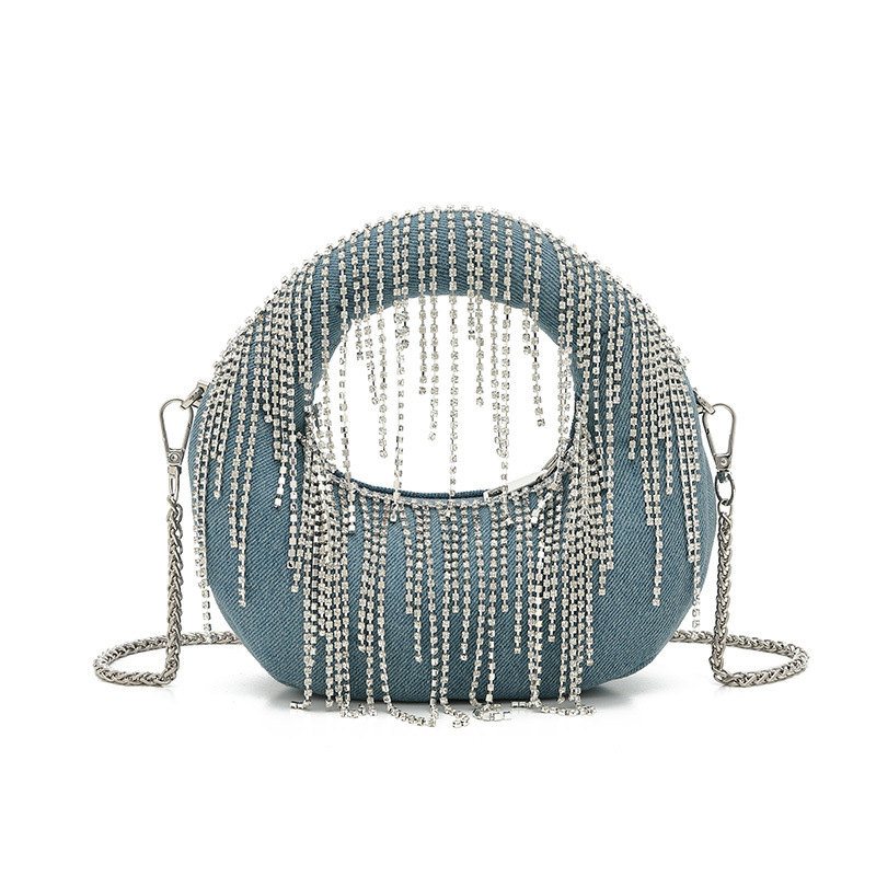 Luxury Denim Rhinestone Evening Clutch with Tassel & Chain Strap