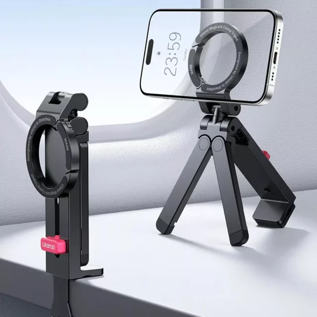 This compact stand is built from lightweight yet durable materials, combining plastic, silicone, and a powerful magnetic system for a firm, wobble-free hold. It folds down small for easy carrying and extends up to 7.4 inches when you need extra height. At only 3.9 ounces, it’s light enough for travel and steady enough for serious content creation.