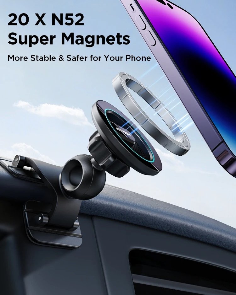 Keep your phone exactly where you want it with this powerful magnetic car phone holder, designed to fit even curved or uneven dashboard surfaces. Thanks to its 20 ultra-strong N52 magnets, this phone mount delivers unbeatable holding power, keeping your device locked in place — even on the bumpiest rides. Whether you’re using GPS, taking hands-free calls, or playing music, this flexible and stable dashboard mount ensures your phone stays secure and visible at the perfect angle.
