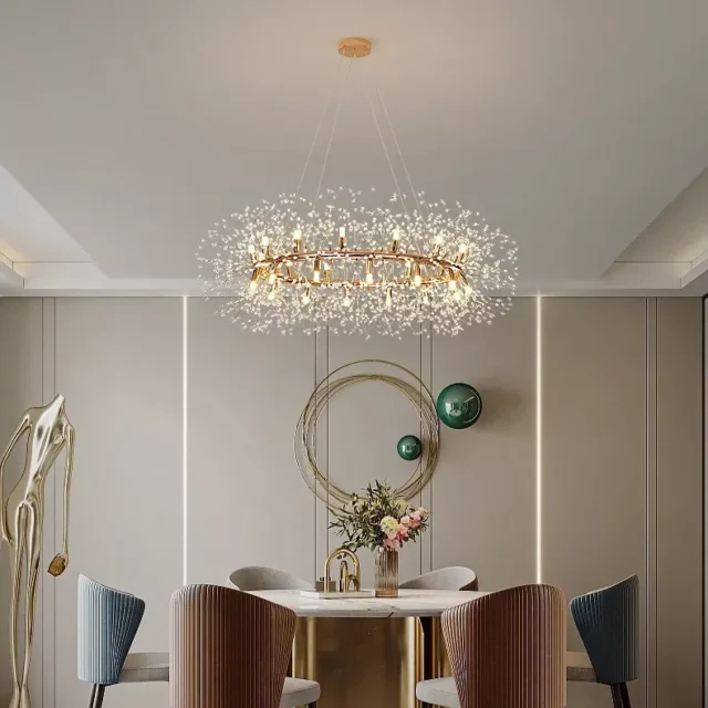 Imagine bringing the magical moment of a dandelion releasing its seeds into your home, frozen in time and illuminated with soft, golden light. This stunning circular pendant light transforms that natural wonder into an exquisite lighting fixture that floats gracefully from your ceiling. With its delicate crystal strands radiating from a central core, this dandelion-inspired chandelier adds organic elegance and contemporary artistry to any space.