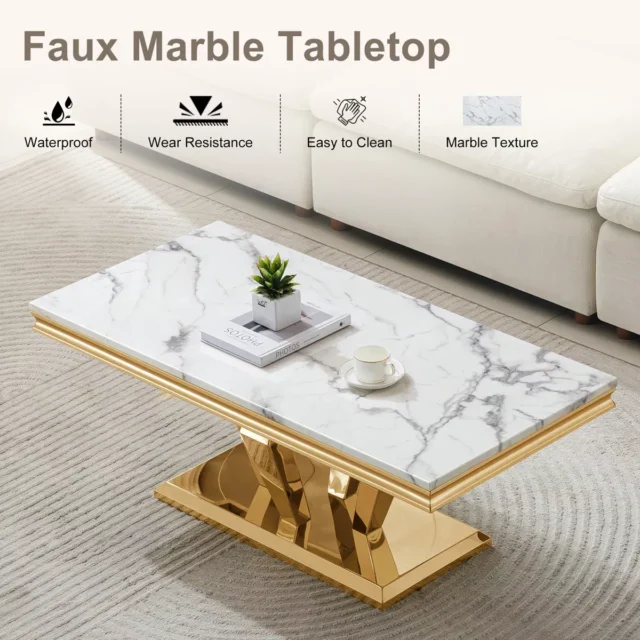 Modern Faux Marble Coffee Table with Gold Diamond Base