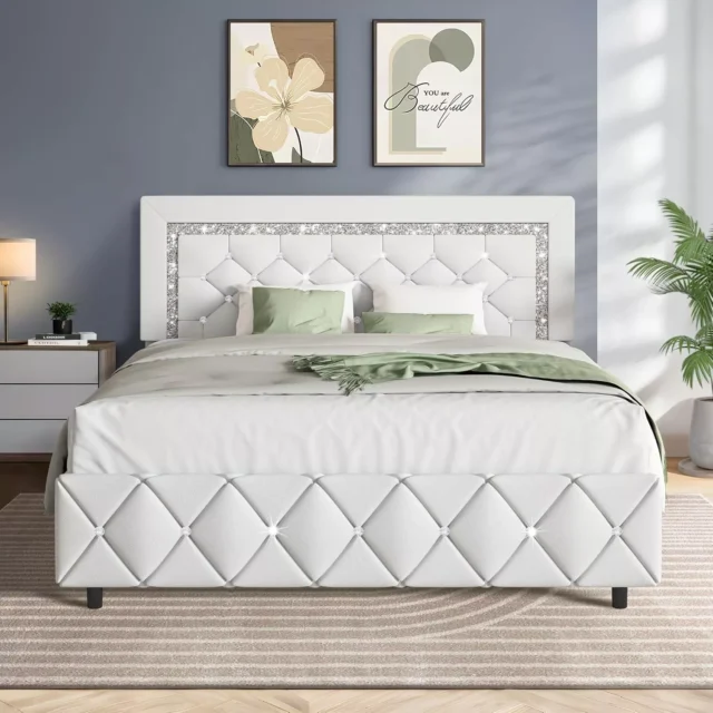 Experience the perfect blend of modern elegance and everyday comfort with this Full Platform Bed Frame featuring a Diamond Tufted Upholstered Headboard. Wrapped in soft faux leather and highlighted by sparkling crystal accents, this bed instantly adds a touch of glamour to your space. Whether you’re redesigning your master suite or upgrading a guest room, this stunning piece will make every night feel like a stay in a boutique hotel.