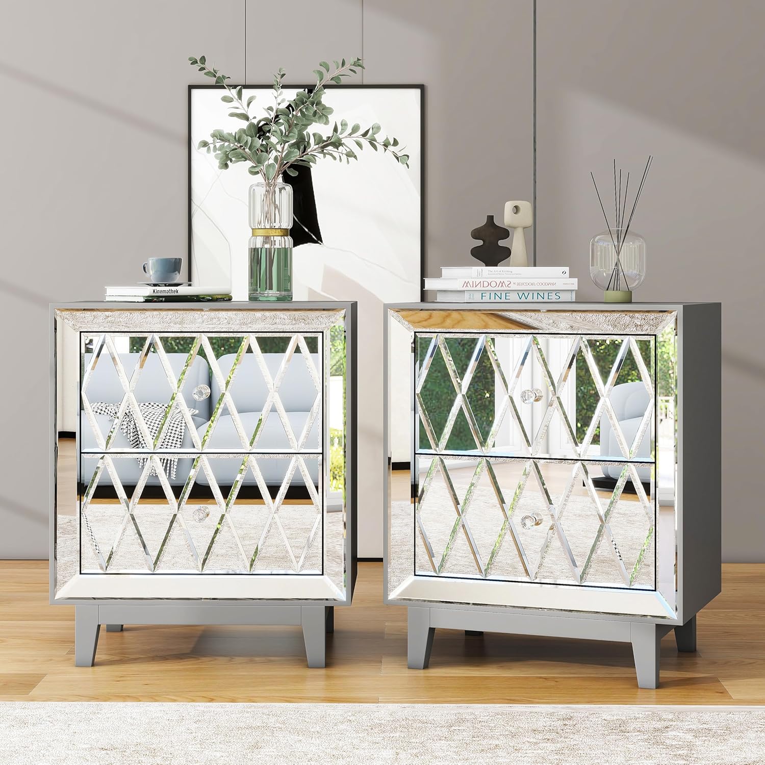 Make your bedroom sparkle with these modern mirrored nightstands. Their combination of function, beauty, and contemporary charm makes them a must-have addition to any stylish home. Add this set to your decor today and enjoy the perfect blend of luxury and practicality every day.