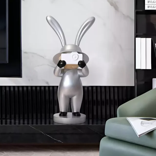 Use this rabbit statue to brighten your day and elevate your home. Whether it’s holding your morning coffee, greeting guests with its quirky charm, or serving as a conversation starter, this piece brings a sense of joy and sophistication to your space. Its semi-handmade craftsmanship ensures each statue is unique, making it an artful treasure in your home.