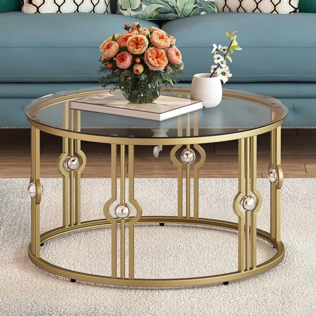 Round Gold Glass Coffee Table for Living Room