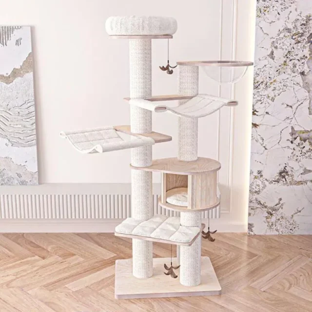 Give your feline friend the ultimate place to play, lounge, and scratch with the Solid Wood Multi-Tier Cat Scratching Tree. Designed for cats of all ages, this beautifully crafted cat tree is more than just a scratching post – it’s a complete entertainment and relaxation center. With its premium solid wood construction and six levels of fun, your pet will love climbing, playing, and napping in their new favorite spot.