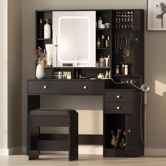 Crafted from durable engineered wood and sized at 42.8”W × 15.6”D × 57”H, this vanity desk fits beautifully in most spaces while offering exceptional functionality. Whether you’re perfecting your daily look, organizing your jewelry, or filming your next beauty tutorial, this vanity is designed to make every moment feel luxurious and convenient.