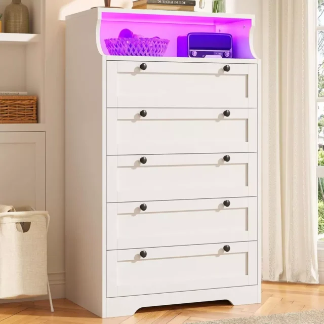 White LED Light Dresser with 5 Drawers & 2 Shelves for Bedroom