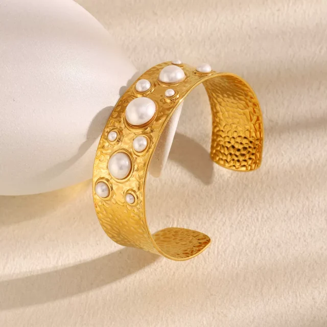 Wide Face Pleated Pearl Open Cuff Bracelet Stainless Steel Gold Plated