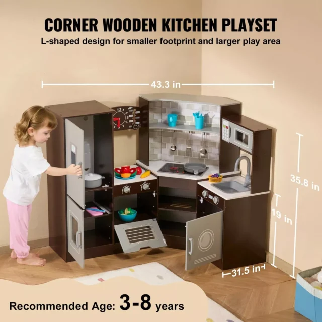 The set comes with 24 exciting accessories — including pots, pans, utensils, cups, and colorful fruits and veggies. These pieces are perfect for teaching kids about colors, shapes, and food groups while improving fine motor skills and hand-eye coordination. With plenty of storage and a clever corner design, this kitchen keeps play areas tidy while maximizing fun space.